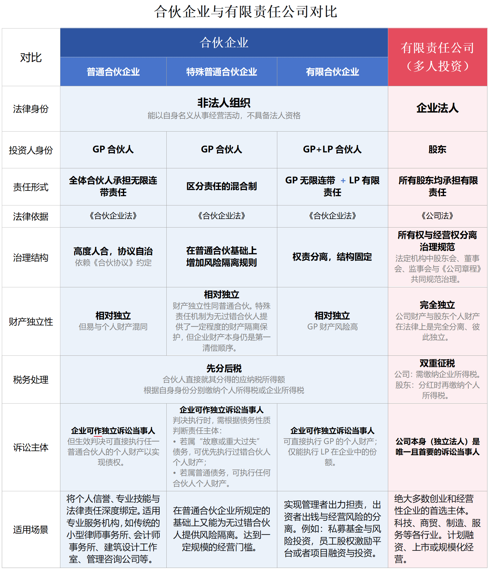 在为客户设计交易结构或提供创业咨询时,我们律师需引导客户在人合性与资合性、无限责任与有限责任、治理灵活性与规范稳定性之间做出权衡,然后选定企业性质,其中差异如下: