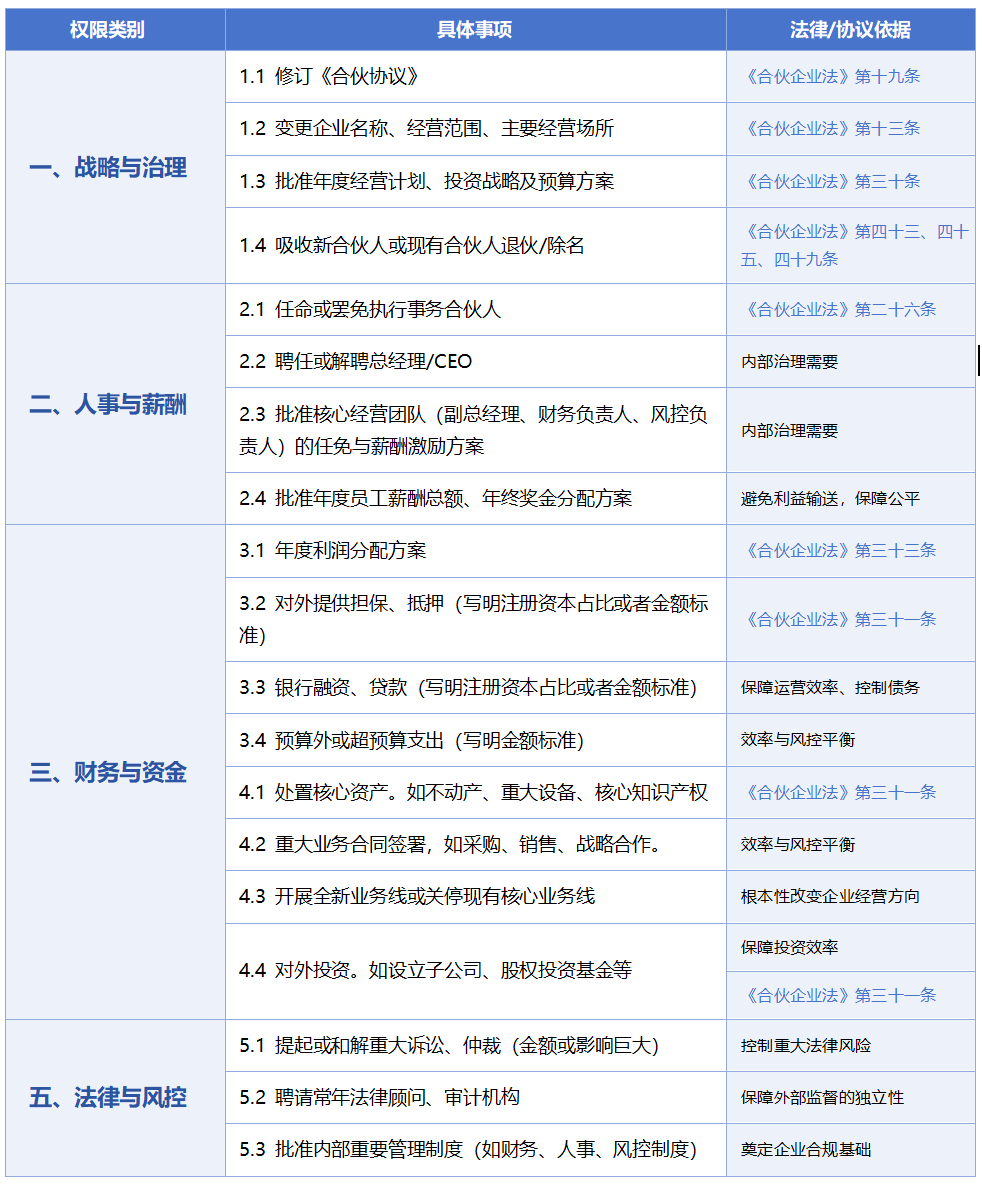 《合伙企业法》第二十六条、第三十一条。将决策权“装进制度的笼子”,防范执行人滥权与内部僵局。 |