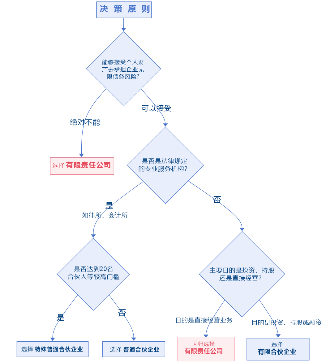 这里选定的原则是:需要将个人家庭财富与公司经营风险彻底分开,法人地位独立,有股权转让和便利融资以及长期规模化经营计划时,应当选择有限责任公司。当项目高度依赖核心成员的个人信誉与专业技能,且合伙人之间高度信任,例如小型、关系紧密的专业团队,如设计工作室、咨询工作室,且愿意共担无限风险,可考虑普通合伙企业。以及达到规模的律师事务所、会计师事务所、税务师事务所等可以选择特殊普通合伙。