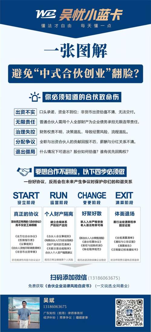 详细关于合伙企业风险的问题,请关注【吴忧小蓝卡】,添加微信13186063675,获取更多法律防范信息,1V1详细咨询。
