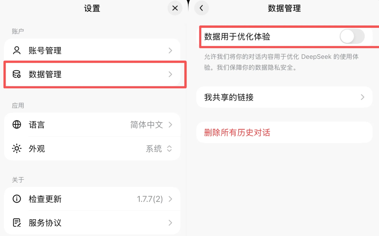 大多数主流AI工具都允许用户关闭优化及改进效果的选项。这个操作能有效防止对话内容被永久储存用于训练模型。我们以常见的AI工具举例:豆包APP允许用户在关闭“隐私与权限”里的“帮助模型改进效果”功能;deepseek允许用户关闭“数据管理”里的“数据用于优化体验”功能。