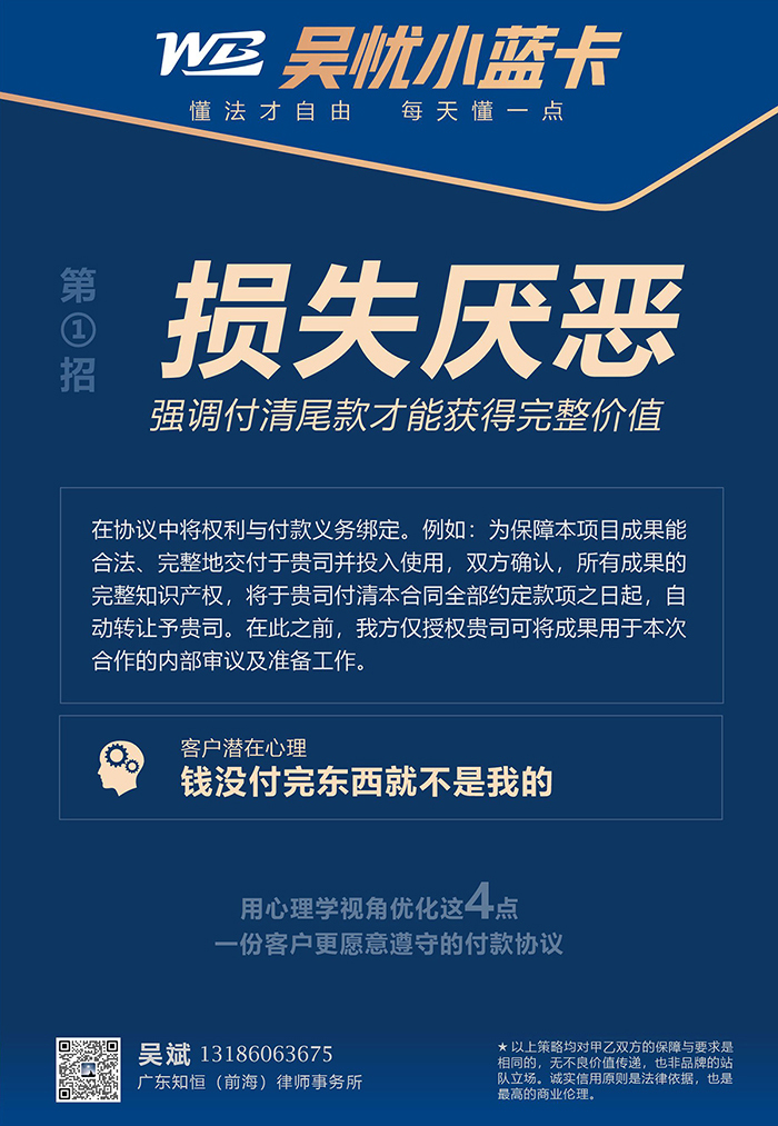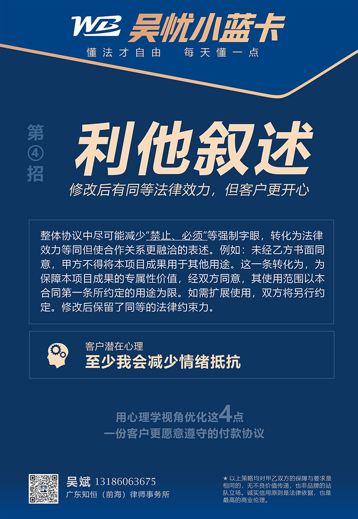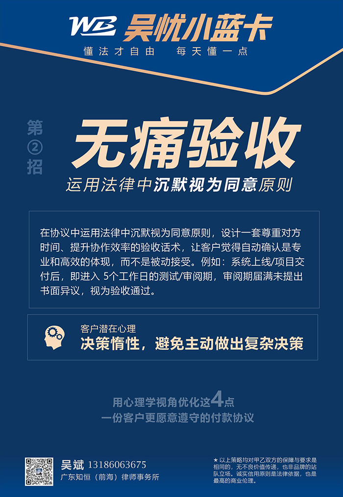 吴忧小蓝卡是我们团队推出的决策型普法品牌。聚焦高痛、高频、高模糊的法律问题,我们主张纠纷尚未发生但需要前置规划,以"解决问题"为导向的轻量化场景式普法,帮助大家提升法律认知与决策效率!