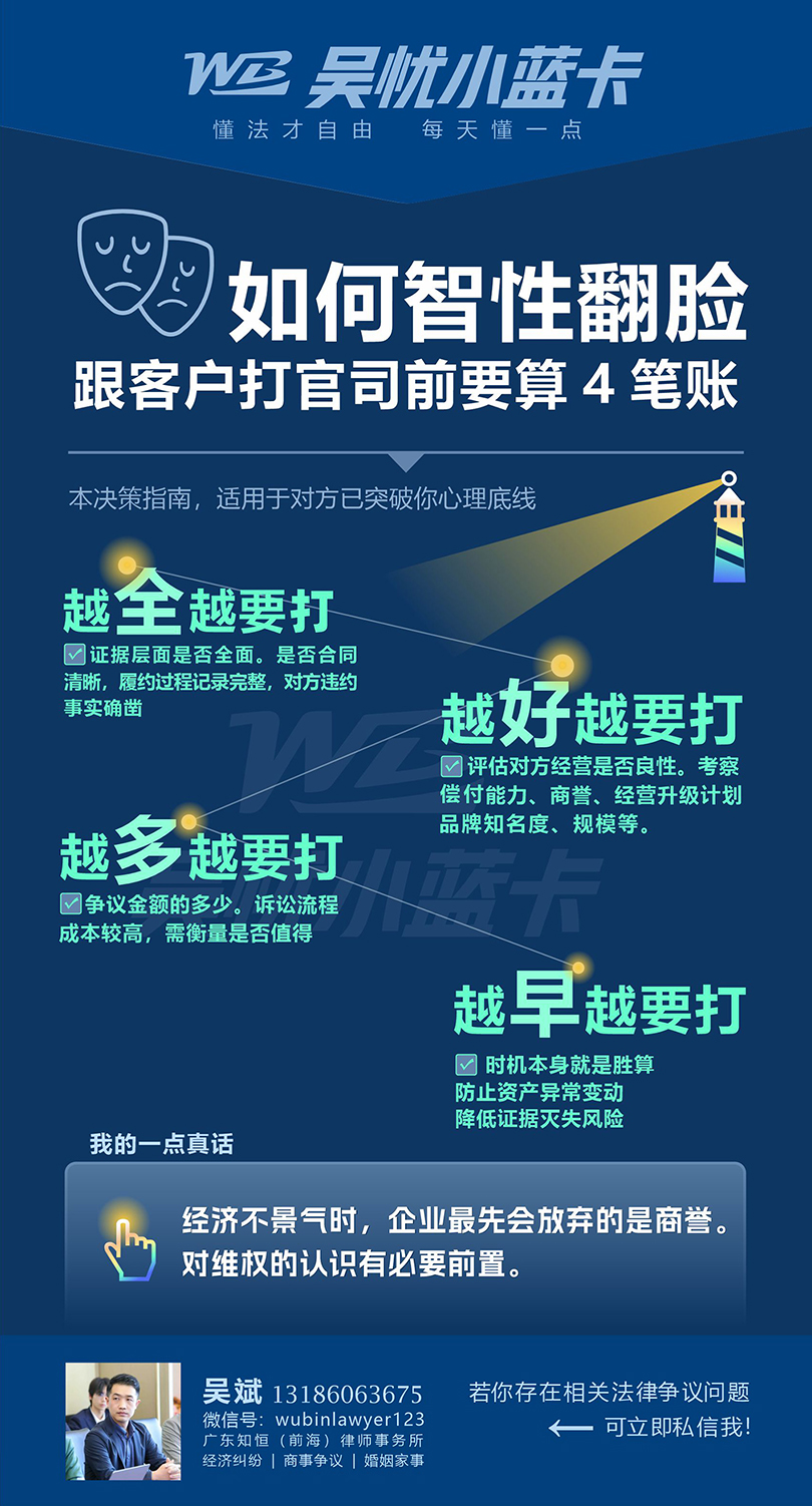 若争议金额可观,对持续经营非常重要,那么值得博弈。因为整体诉讼流程中需要支付的金钱、时间、精力成本较高,我们一切动作都是以最小成本去达到目的。
